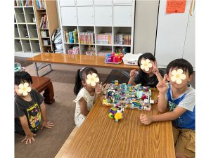 レゴで大作を作り上げた記念にパシャリ。一年生だけで大きな作品を協力して作りました。いつもは上級生が作ってくれた「世界」に入れてもらって遊んでいましたが、みんなの創造力と想像力が広がり大きな「世界」が完成しました。