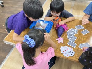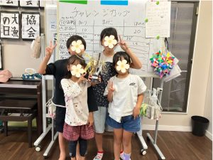 高学年をリーダーに3チームに分かれて競います。チーム全員で力を合わせて様々なゲームに挑戦して高得点を目指します。最高得点のチームは優勝カップに名前が刻まれ表彰されます。みんな真剣に楽しんでいました。