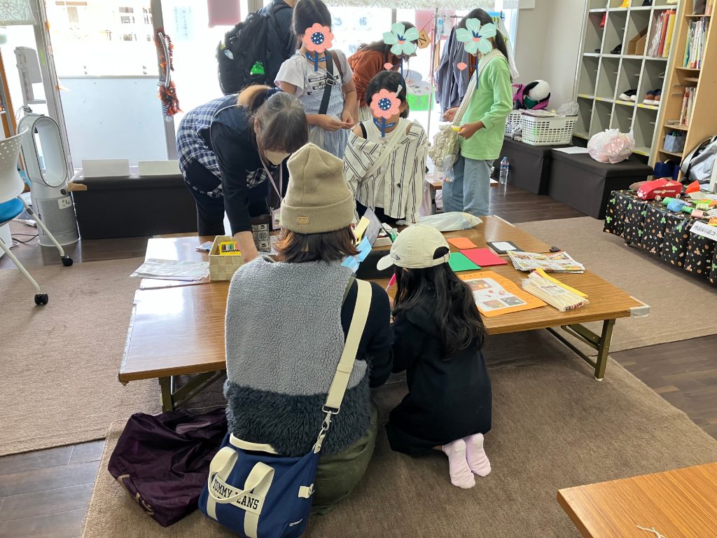 「製作」スペースでは、プリントされた絵を色画用紙のカードに切り貼りして、飛び出すクリスマスカードや勤労感謝のサンキューカード製作を楽しんでいただきました。
