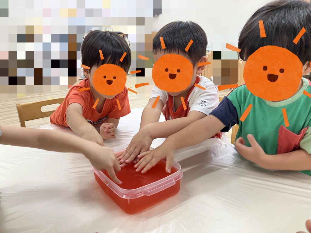 8月は、暑い日が続きましたが、園では子どもたちが元気いっぱいに過ごしました。水分補給や適度な休憩を取りながら、涼を感じられる様々な活動に取り組みました。寒天あそびやスライム遊び、色氷遊びなどを通して、手触りや冷たさを感じながら、夏ならではの楽しさを満喫しました。